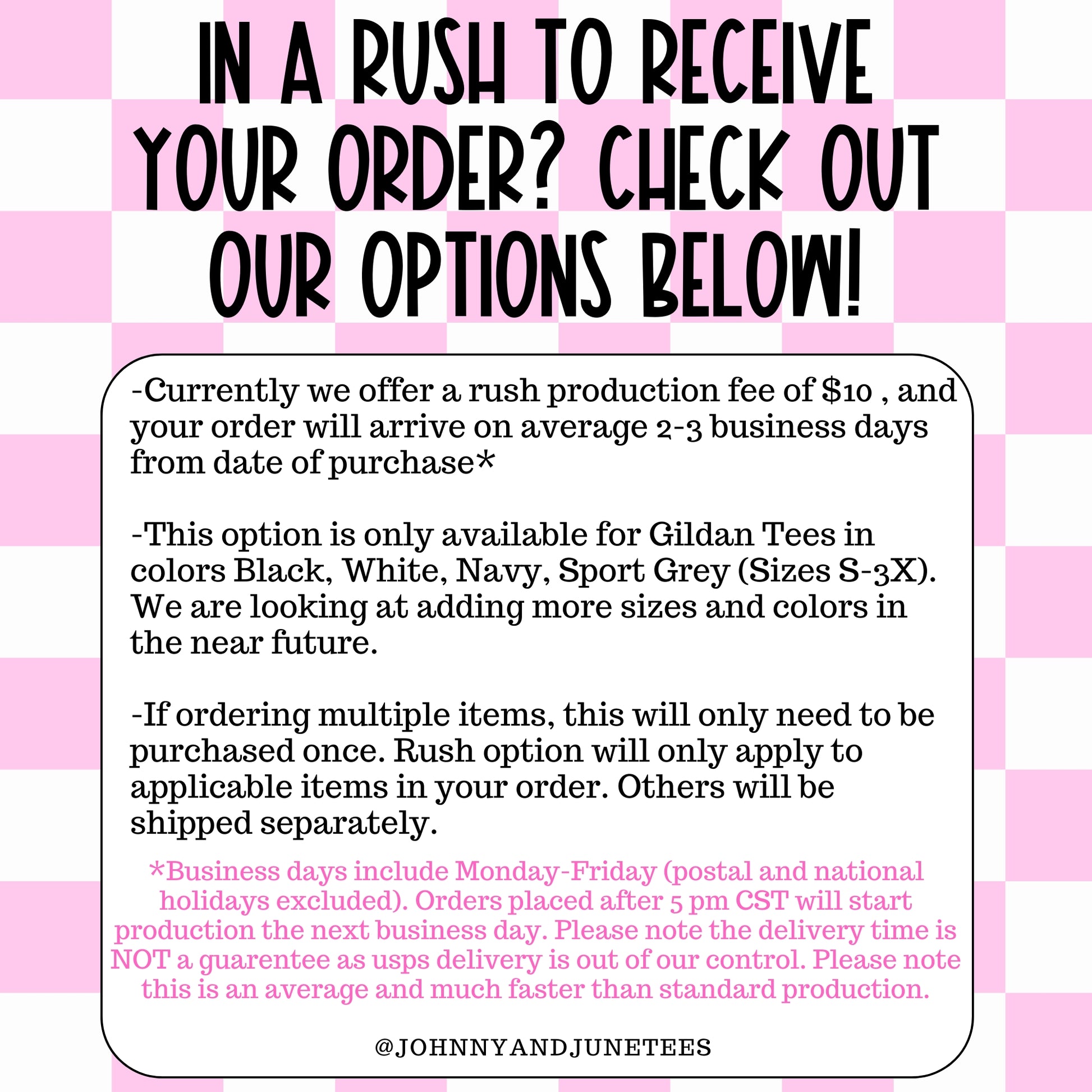 -Need your order delivered in 2-3 days? Add RUSH PRODUCTION to your order!
